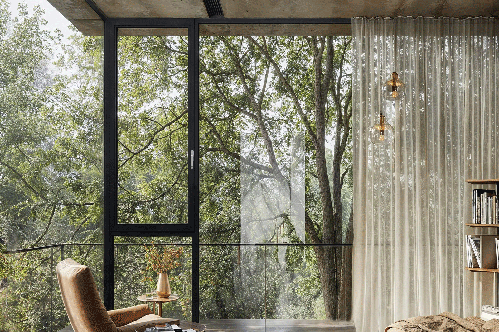 框扇室內(nèi)外平齊設計,線條簡約利落,立面效果簡潔平整。窗扇開啟狀態(tài),開啟扇與建筑外立面平行。